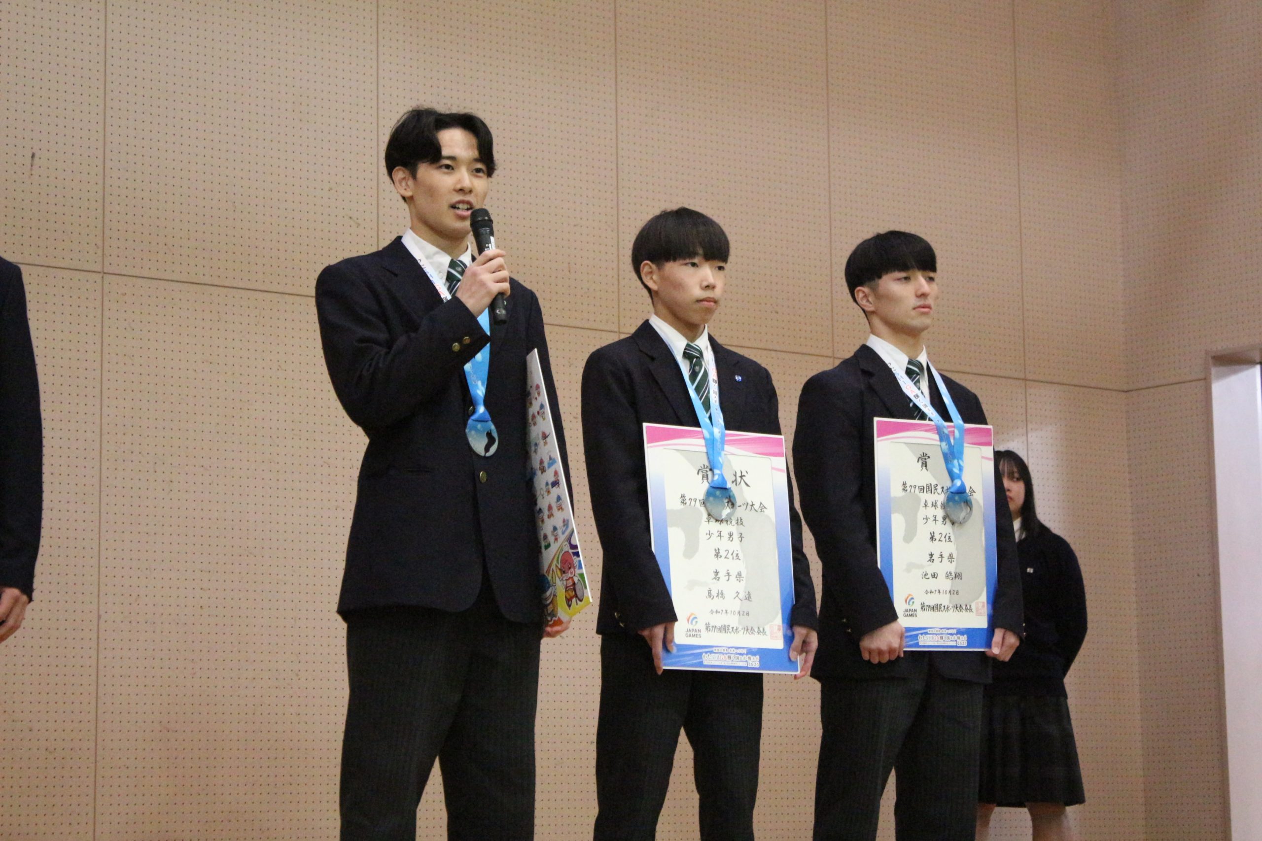 [卓球部]令和7年9月28日(日)から滋賀県野洲市総合体育館で開催されました「わたSHIGA輝く 第79回国民スポーツ大会2025卓球競技会」において、岩手県代表・少年男子チームとして本校卓球部監督の野田先生、メンバーとして渡邉崚さん、池田皓翔さん(3年)、髙橋久遠さん(2年)が出場。予選リーグを1位通過、岩手県勢初の決勝進出を果たしました。