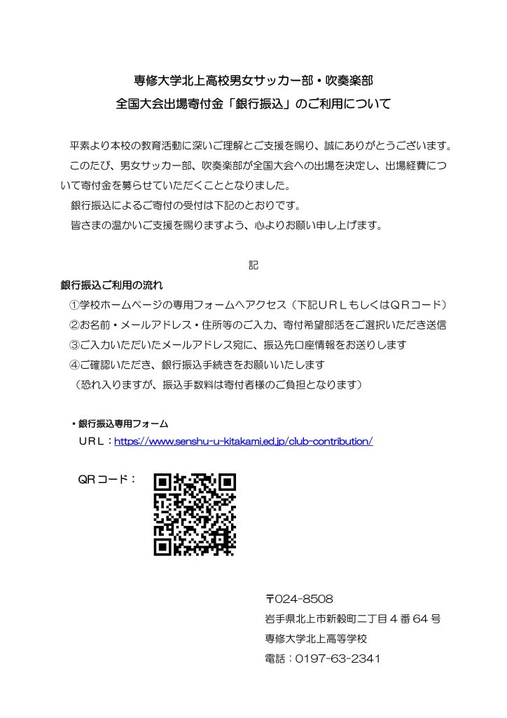 全国大会出場に伴う寄付受付フォームについて【銀行振込用】